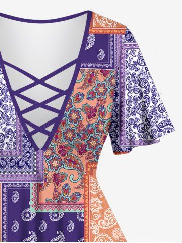 Plus Size Floral Paisley Scarf Print Lattice Crisscross Flare Sleeve T-shirt - Purple - 4x