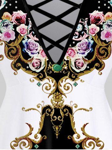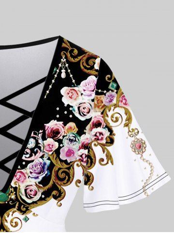 A*****r5Plus Size Flower Chains Gem Colorblock Printed Crisscross Short Sleeve T-shirt and Flare Pants OutfitColor: BLACKReally lovely set. Bought as part of my holiday wardrobe and really happy. Fits well and is super comfy. So lovely to have something nice for the larger ladies xxx