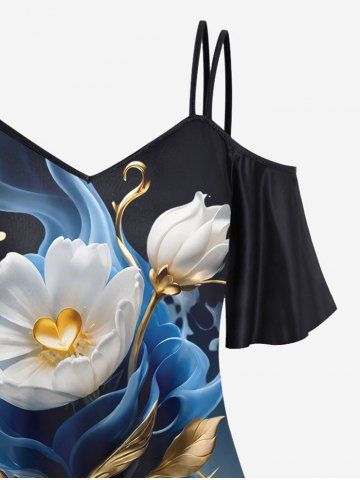 Plus Size Flower Leaf Heart Fog Ombre Colorblock 3D Print Cold Shoulder T-shirt - Black - L