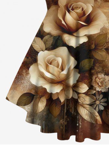 Plus Size Flower Leaf Print Lattice Crisscross Flare Sleeve T-shirt - Coffee - 1x