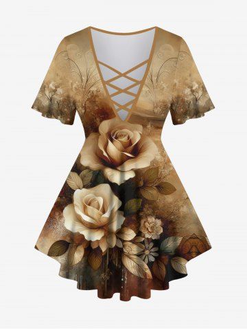 Plus Size Flower Leaf Print Lattice Crisscross Flare Sleeve T-shirt - Coffee - 3x