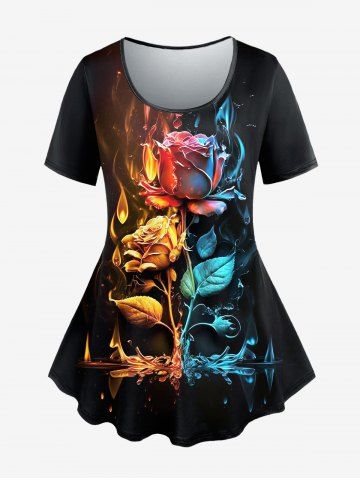 Plus Size Flower Leaves Flame Print Short Sleeves T-shirt - Black - 3x