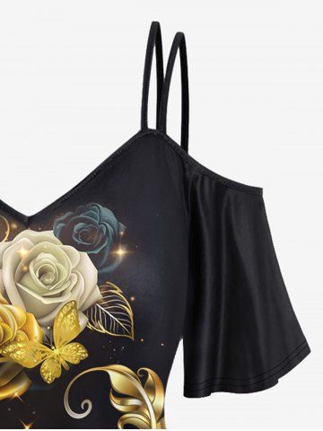 Graphic Tees > Plus Size Flower Leaves Glitter Print Cold Shoulder T-shirt