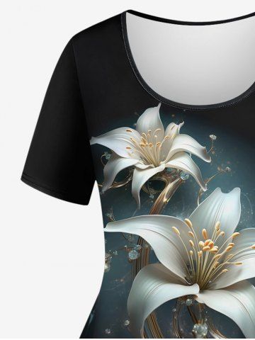 Plus Size Flowers Glitter 3D Print T-shirt - Black - 3x