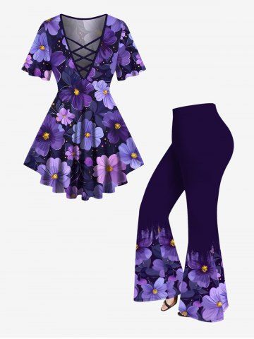 Plus Size Flowers Leaf Star Print Lattice Crisscross T-shirt - Purple - L