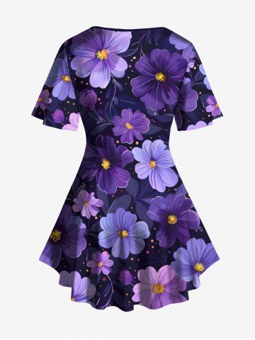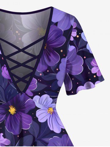 Plus Size Flowers Leaf Star Print Lattice Crisscross T-shirt - Purple - 4x