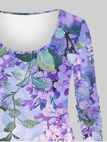 Plus Size Flowers Leaf Wtercolor Painting Ombre Print Long Sleeve T-shirt - Purple - 1x