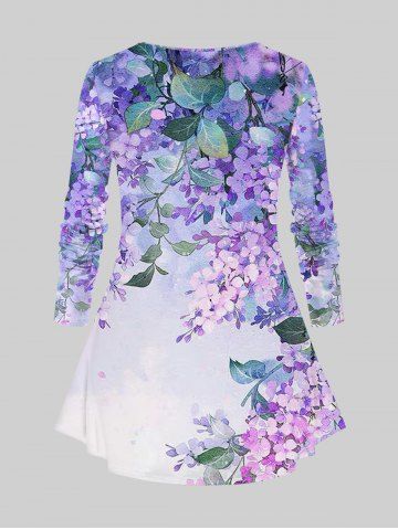 Plus Size Flowers Leaf Wtercolor Painting Ombre Print Long Sleeve T-shirt - Purple - 3x