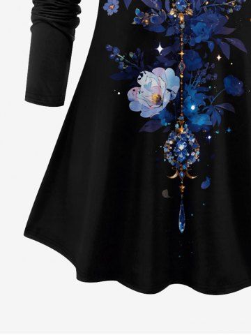 Plus Size Flowers Moon Gem Pendant Print Long Sleeves T-shirt - Black - 2x