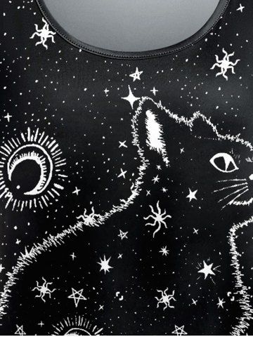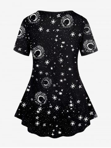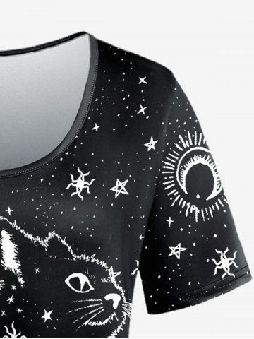 Plus Size Galaxy Cat Moon Sun Print Short Sleeves T-shirt - Black - 2x