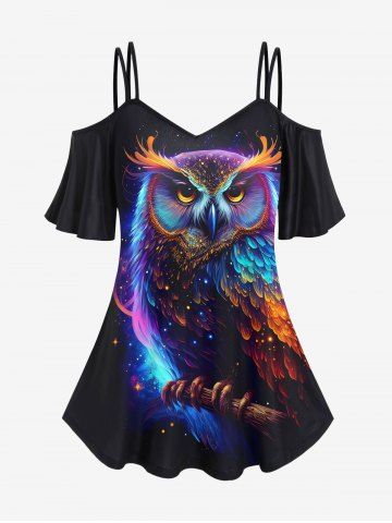 k*****h5Plus Size Galaxy Colorful Owl Star Glitter 3D Print Cold Shoulder T-shirtColor: BLACK Size: XSVery cute and playful design I had to order another one for my granddaughter