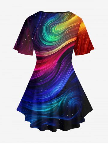 Plus Size Galaxy Rainbow Color Swirls Glitter Print Lattice Crisscross Flare Sleeve T-shirt - Multi-a - L