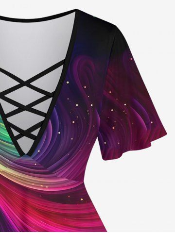 Plus Size Galaxy Rainbow Color Swirls Glitter Print Lattice Crisscross Flare Sleeve T-shirt - Multi-a - 1x