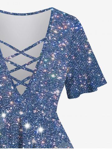 Plus Size Galaxy Sparkling Sequin Glitter Knitted 3D Print Lattice Crisscross Flare Sleeve T-shirt - Blue - 6x