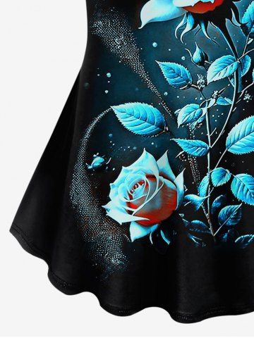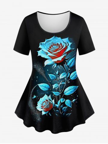 Plus Size Glitter Light Beam Rose Flower Print T-shirt - Black - Xs