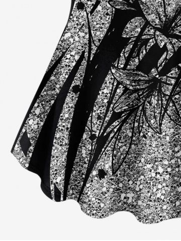 Plus Size Glitter Sequins Flower Print Short Sleeves T-shirt - Black - S