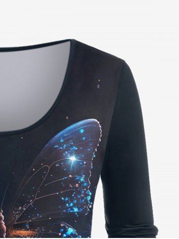 Plus Size Glitter Sparkling Butterfly Galaxy Light Beam Print Long Sleeves T-shirt - Deep Blue - Xs