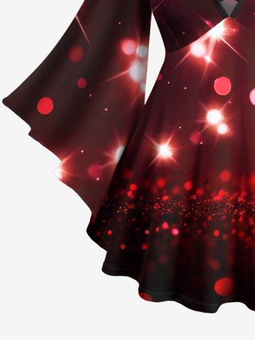 Plus Size Glitter Sparkling Christmas Light Print Ombre Lattice Long Sleeves T-shirt - Deep Red - Xs