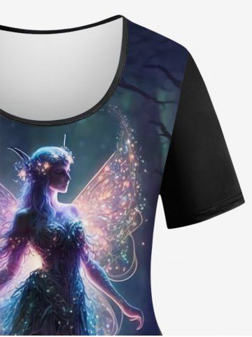 Renaissance Plus Size Glitter Sparkling Elf Angel Wing Galaxy Tree Branch Leaf Print Ombre T-shirt - Black - 5x