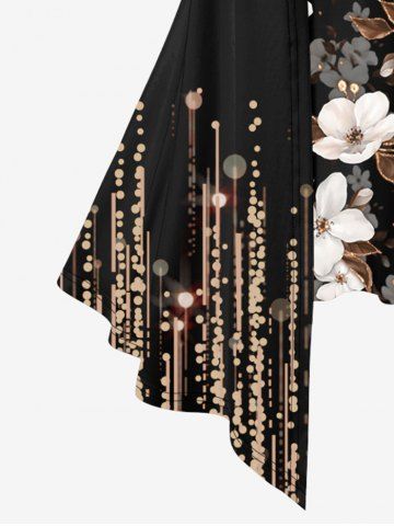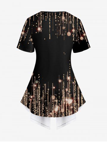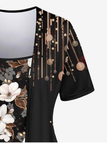 Plus Size Glitter Sparkling Light Beam Floral Print Patchwork Asymmetric 2 in 1 T-shirt - Black - 2x