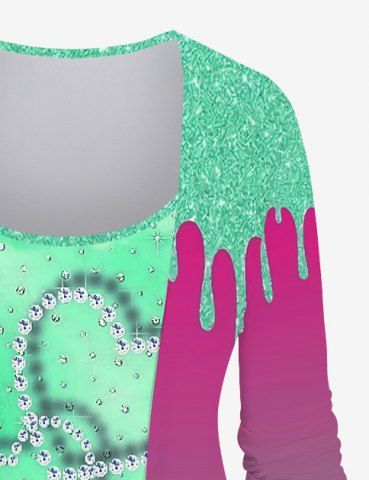 Graphic Tees > Plus Size Glitter Sparkling Rhinestone Heart Paint Drop Sequins Printed Valentines Asymmetric Patchwork Ombre 2 in 1 Top