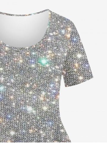 Plus Size Glitter Sparkling Sequin 3D Print Crew Neck T-shirt - Silver - Xs