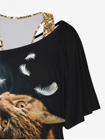 Plus Size Glitter Sparkling Sequins Racerback Tank Top and Cat Feather Print Ombre Batwing Sleeves T-shirt Set - Black - S