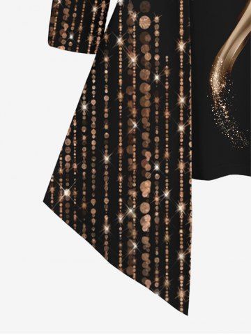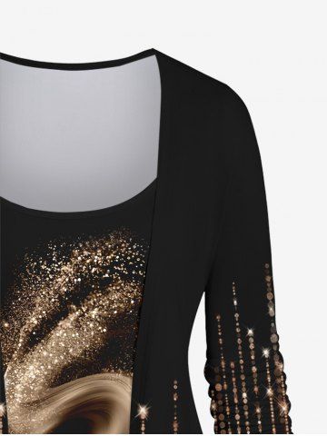 Plus Size Glitter Sparkling Sequins Tassel Line Fire Print Asymmetric Patchwork 2 in 1 Long Sleeves Top - Black - 2x