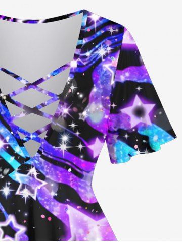 Plus Size Glitter Sparkling Stars Ombre Striped Colorblock Print Lattice T-shirt - Purple - 1x