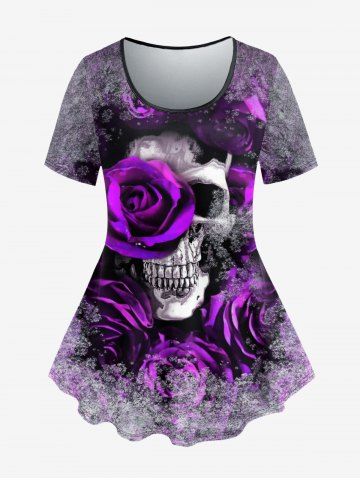 Plus Size Halloween Skull Flower Fog Print T-shirt - Purple - M