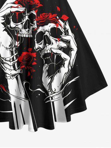 Plus Size Hand Skulls Rose Flower Print Lattice T-shirt - Black - M