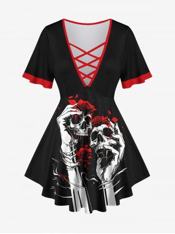 Plus Size Hand Skulls Rose Flower Print Lattice T-shirt - Black - 1x