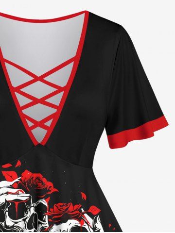 Plus Size Hand Skulls Rose Flower Print Lattice T-shirt - Black - 3x