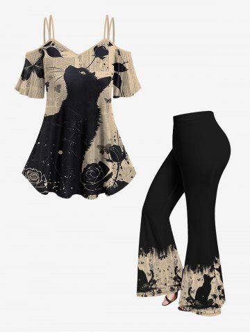 D*****a5Ink Painting Rose Flower Leaf Butterfly Cat Newspaper Print T-shirt and Flare Pants Plus Size Matching SetColor: LIGHT COFFEEI am completely happy about it and will have fun wearing it