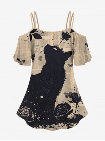 Graphic Tees > Plus Size Ink Painting Rose Flower Leaf Butterfly Cat Newspaper Print Cold Shoulder Cami T-shirt