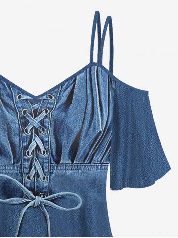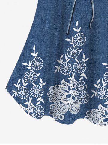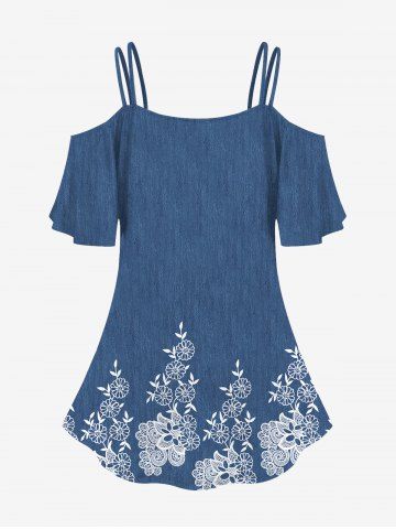 Plus Size Lace Up Flowers Ruched Denim 3D Print Cold Shoulder T-shirt - Blue - 2x