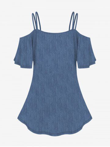 Plus Size Lace Up Ruched Corset Denim 3D Print Cold Shoulder T-shirt - Blue - S
