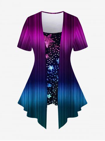 C*****y5Plus Size Light Beam Sparkling Pentagram Print Ombre Asymmetric 2 in 1 T-shirtColor: PURPLE Size: 4XVery nice, good size, good color, quick delivery, hood quality