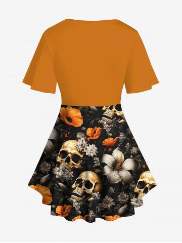 Plus Size Lily Flower Skulls Print Lattice Patchwork Top - Orange - 6x
