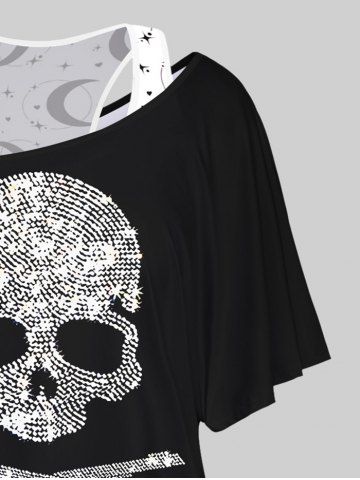 Plus Size Moon Star Heart Print Racerback Tank Top and Skull Guns Sparkling Sequin 3D Print One Shoulder T-shirt - Black - 5x