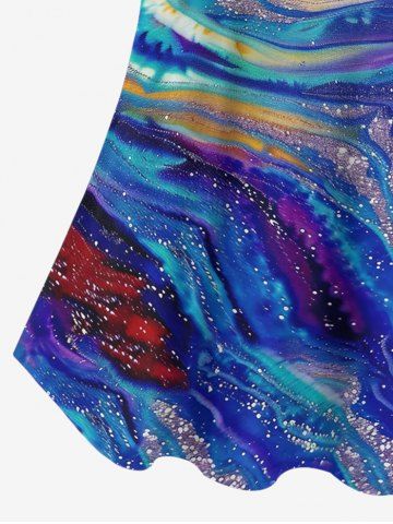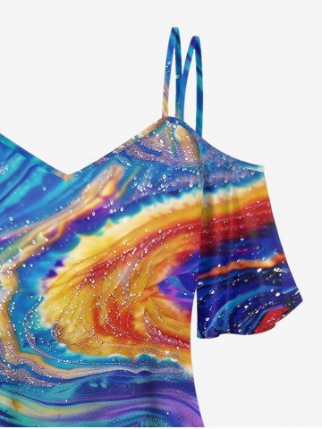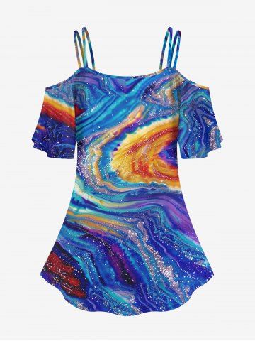 Plus Size Oil Painting Colorblock Glitter Sparkling Sequin 3D Print Cold Shoulder T-shirt - Blue - 2x