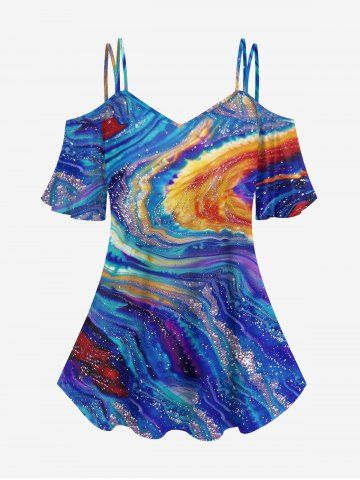 Plus Size Oil Painting Colorblock Glitter Sparkling Sequin 3D Print Cold Shoulder T-shirt - Blue - 4x