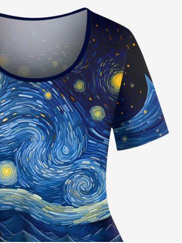 Plus Size Oil Painting Swirls Galaxy Moon Mountains Print T-shirt