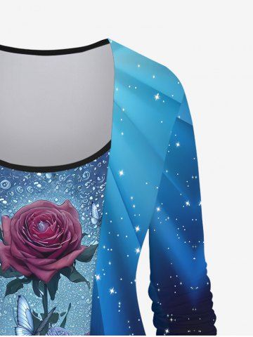 Plus Size Ombre Colorblock Rose Flower Butterfly Glitter Sparkling Sequin 3D Print 2 In 1 T-shirt - Blue - M