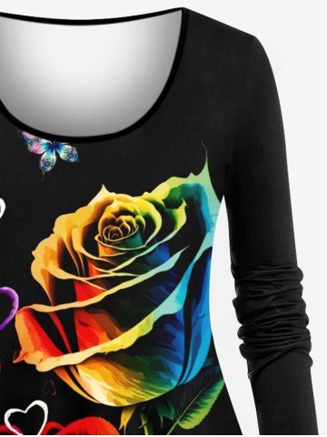 Plus Size Ombre Rose Flower Heart Butterfly Print Valentines Long Sleeves T-shirt - Black - M