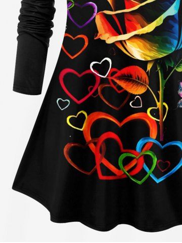 Plus Size Ombre Rose Flower Heart Butterfly Print Valentines Long Sleeves T-shirt - Black - 1x
