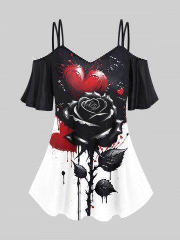 Graphic Tees > Plus Size Paint Dripping Rose Flower Colorblock Print Cold Shoulder T-shirt