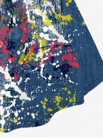 Plus Size Paint Splatter Pockets Buttons Denim 3D Print T-shirt - Deep Blue - Xs