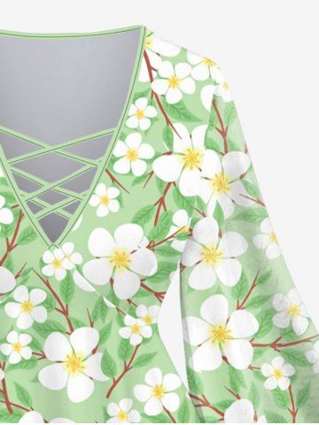 Plus Size Peach Blossom Flowers Leaf Print Lattice Crisscross Flare Sleeve Top - Green - 4x