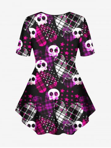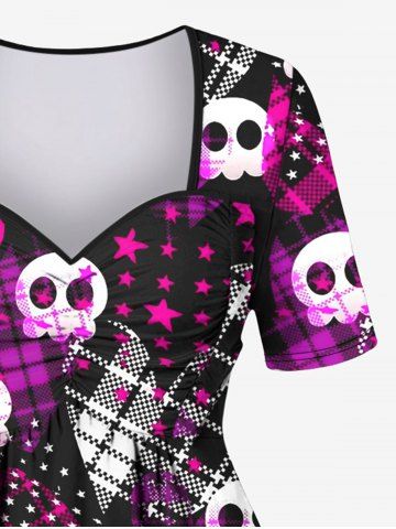 Plus Size Plaid Heart Cute Skull Stars Print Ruched T-shirt - Purple - 6x
